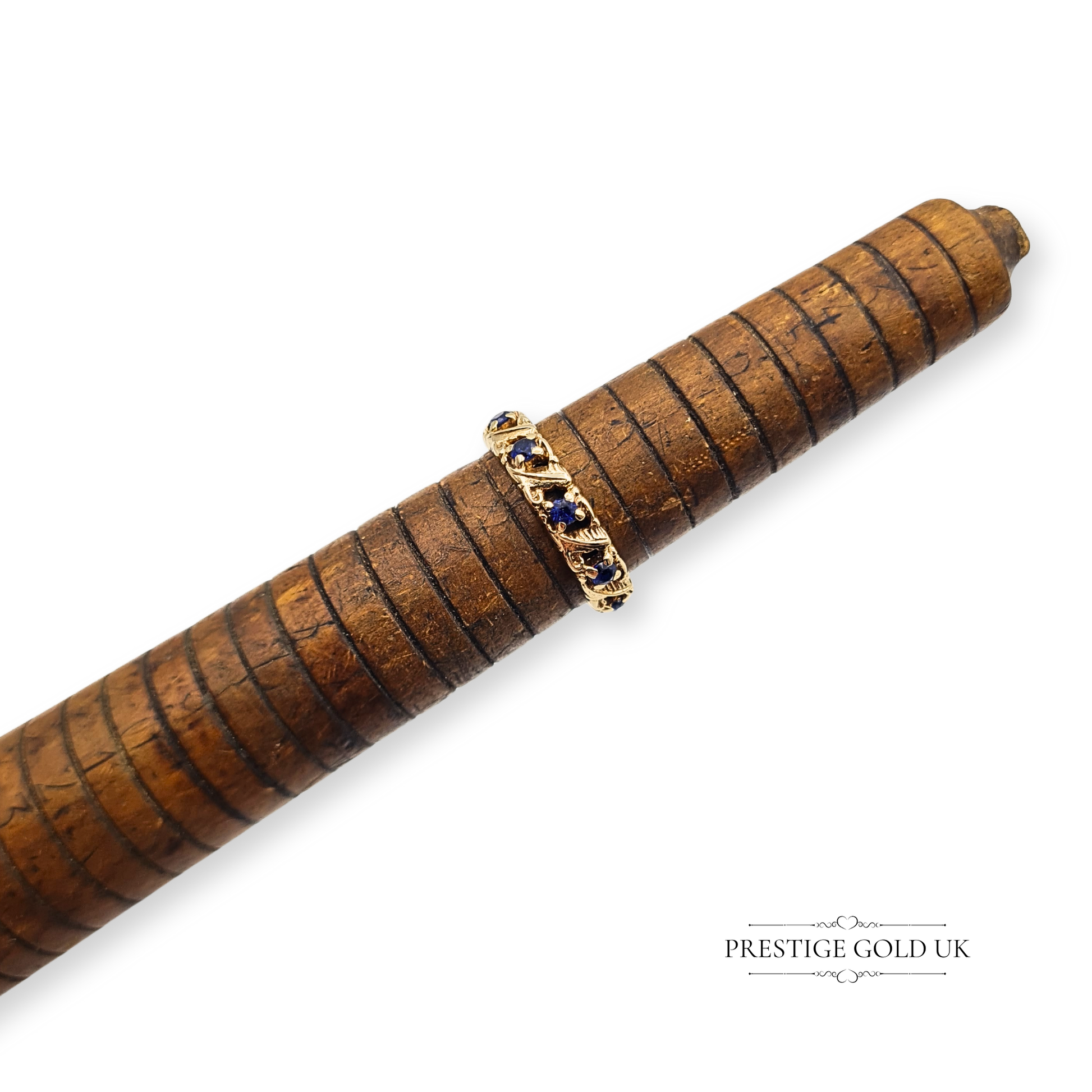 Weighing 2.6g and tested as 9ct gold, this ornate sapphire full eternity ring features a continuous band of deep blue sapphires set within a detailed openwork design. It has a striking, decorative presence that works beautifully as a standalone ring or layered within a stack. The intricate patterning and rich contrast of gold and sapphire give this band its unique charm, making it a timeless treasure for daily wear or special occasions. Only one available.