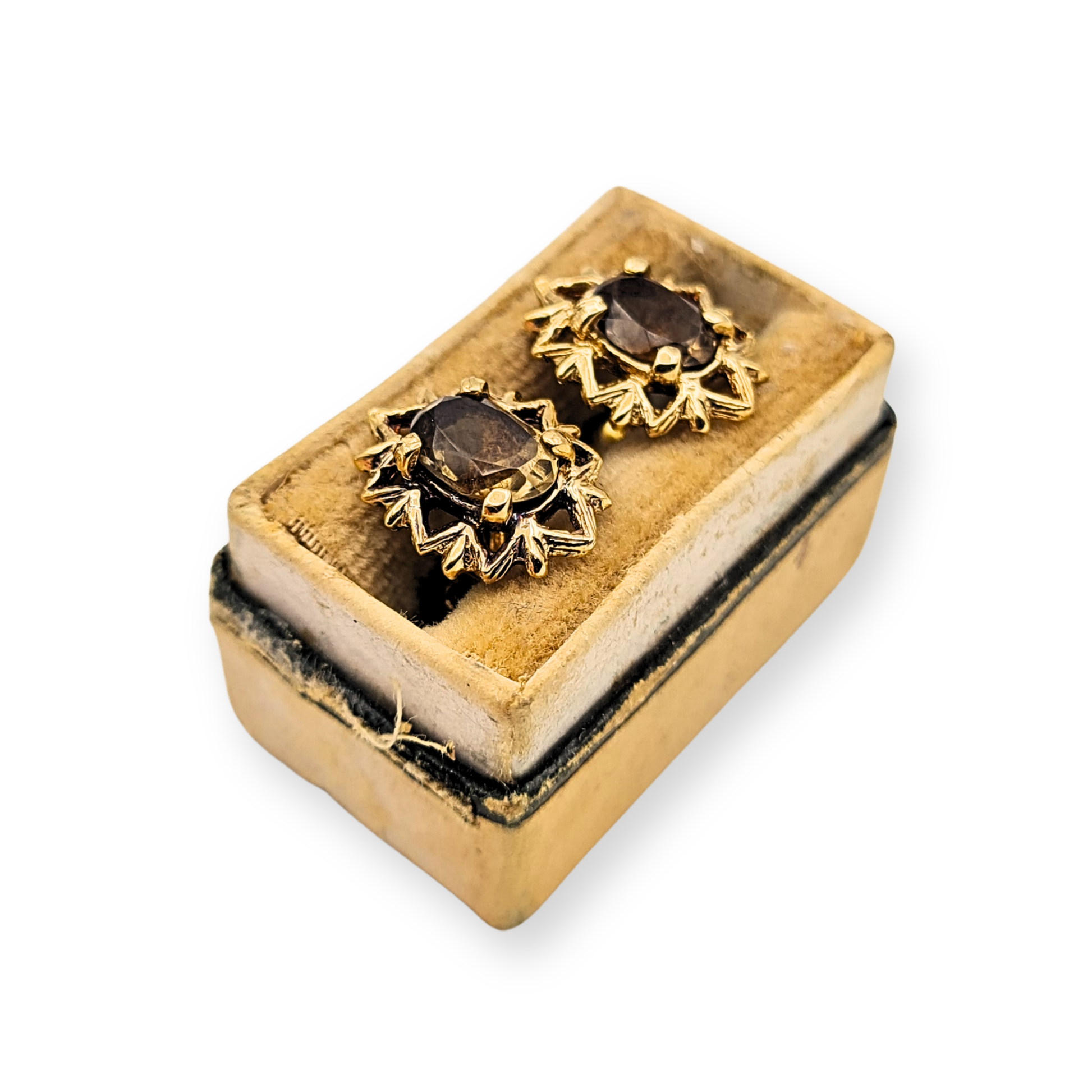 1.89g pair of 9ct gold oval smoky quartz stud earrings measuring approximately 12mm tall and 10mm wide, fully British hallmarked. Rich smoky quartz gemstones are claw set within a decorative gold starburst style surround. Classic post and butterfly back fittings for secure everyday wear. Only one available.