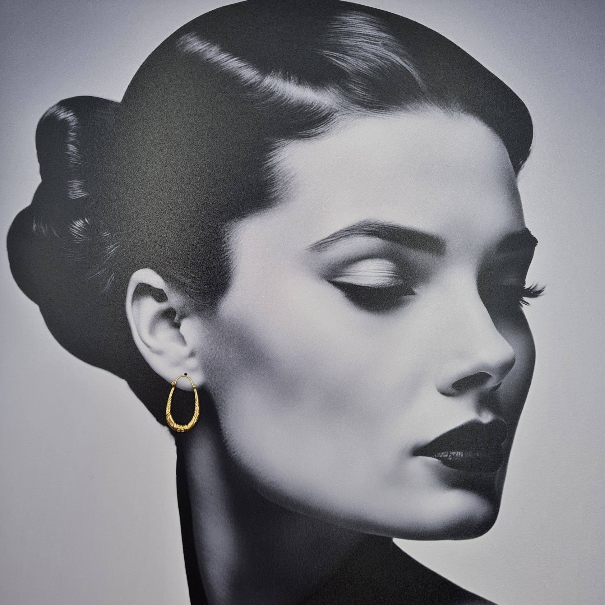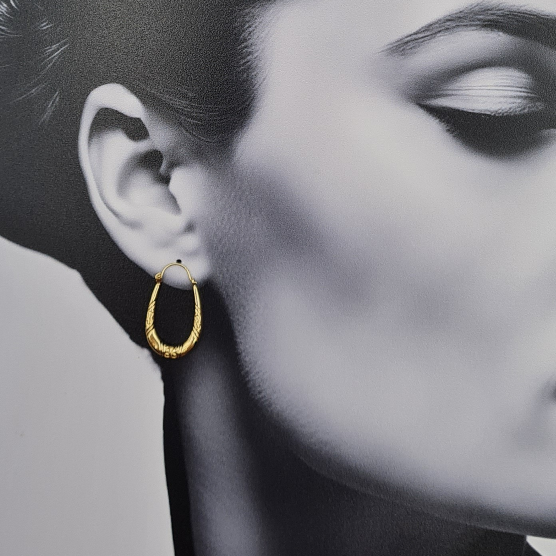 Stamped 375 and weighing just 1.14g, these 9ct gold creole earrings feature an elegant oval shape with intricate engraved detailing that gives a refined, vintage-inspired finish. Measuring approximately 26mm tall and 15mm wide, they offer a flattering mid-size drop — subtle enough for everyday wear yet polished enough to elevate an evening look. Fitted with secure flip-top fasteners and finished with a warm golden sheen, they make a timeless addition to any gold collection. Only one available.