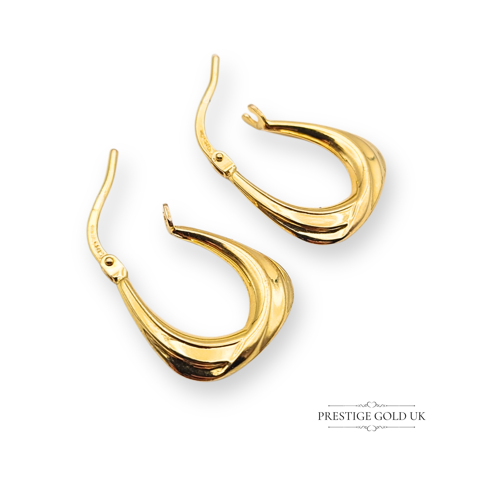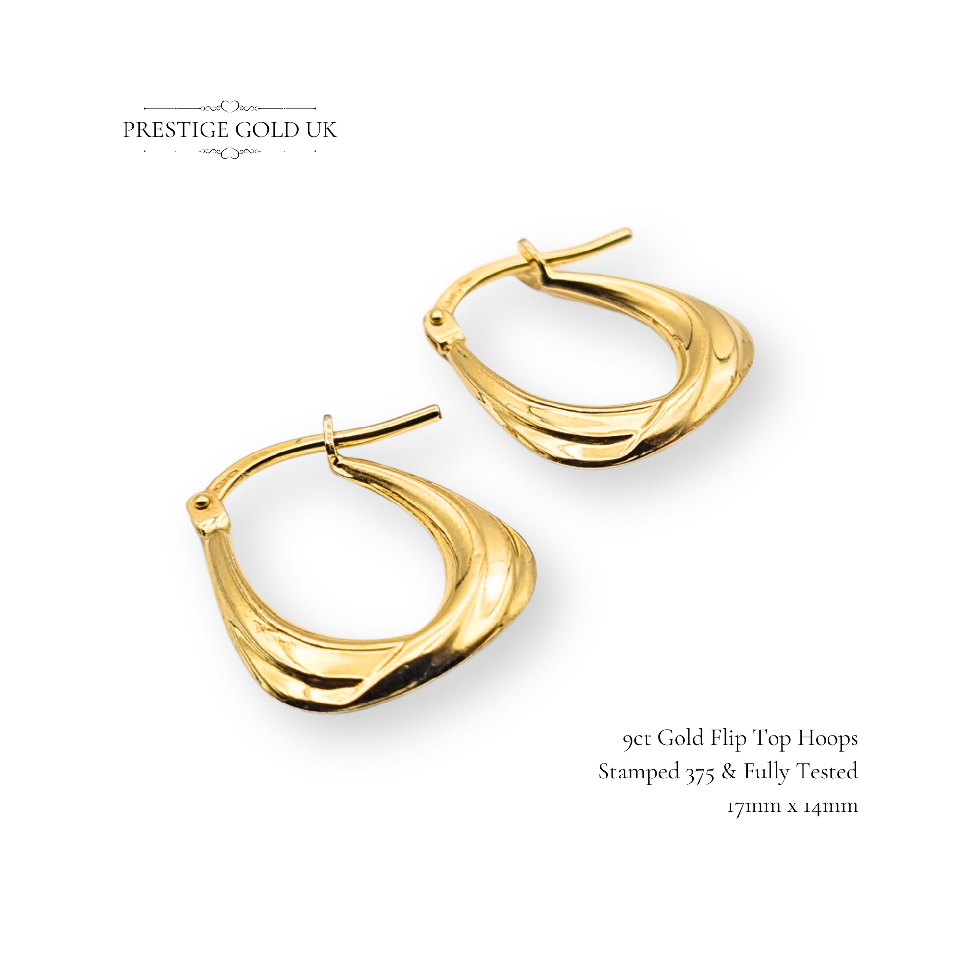 Weighing 0.8g and crafted in 9ct yellow gold, these elegant hoop earrings feature a distinctive flat-bottomed square design with flip-top fasteners for secure wear. Measuring 17mm tall by 14mm wide and 2.5mm thick, they offer a bold yet lightweight look that makes them ideal for everyday wear. A refined vintage pair of gold hoops, versatile enough for day or evening. Only one available.