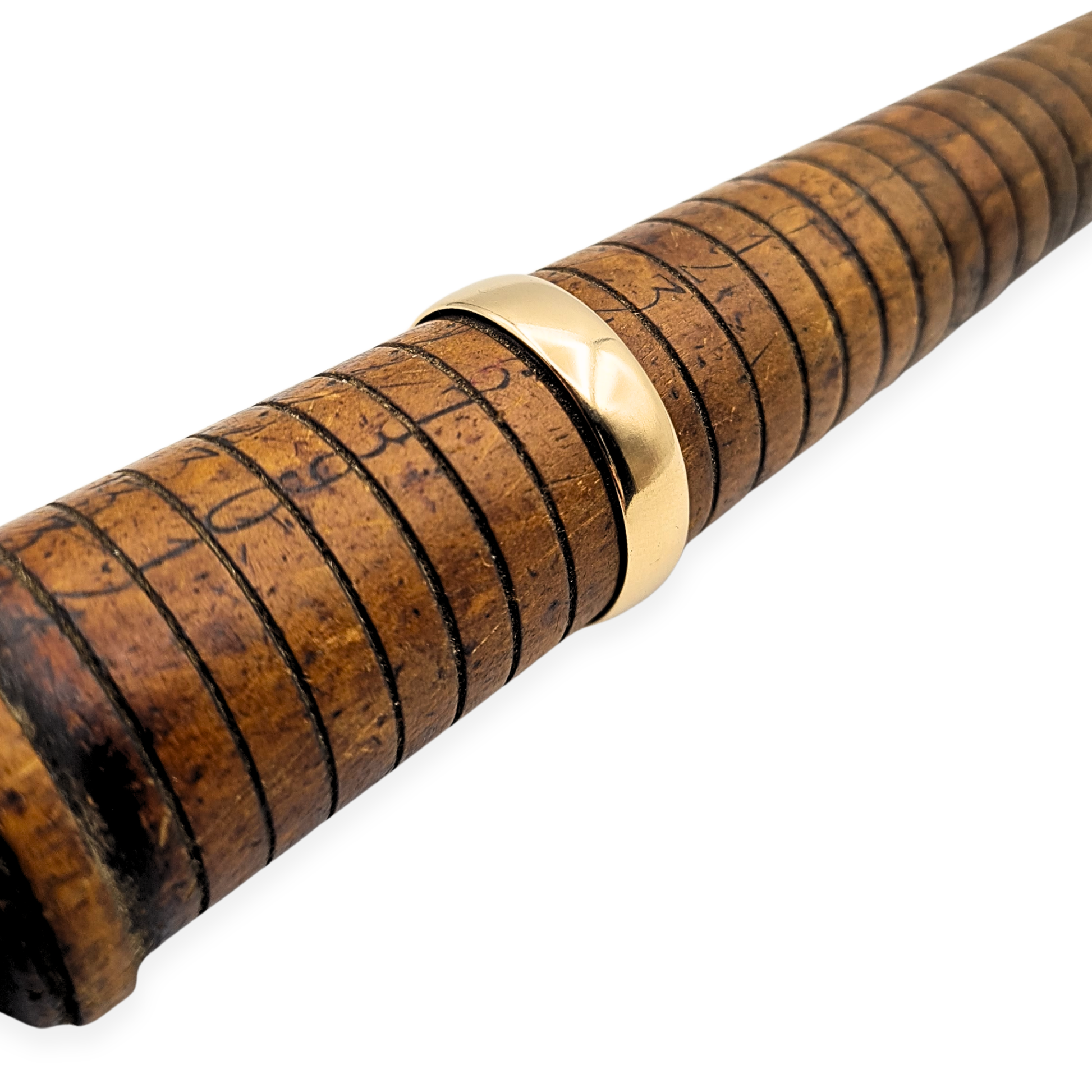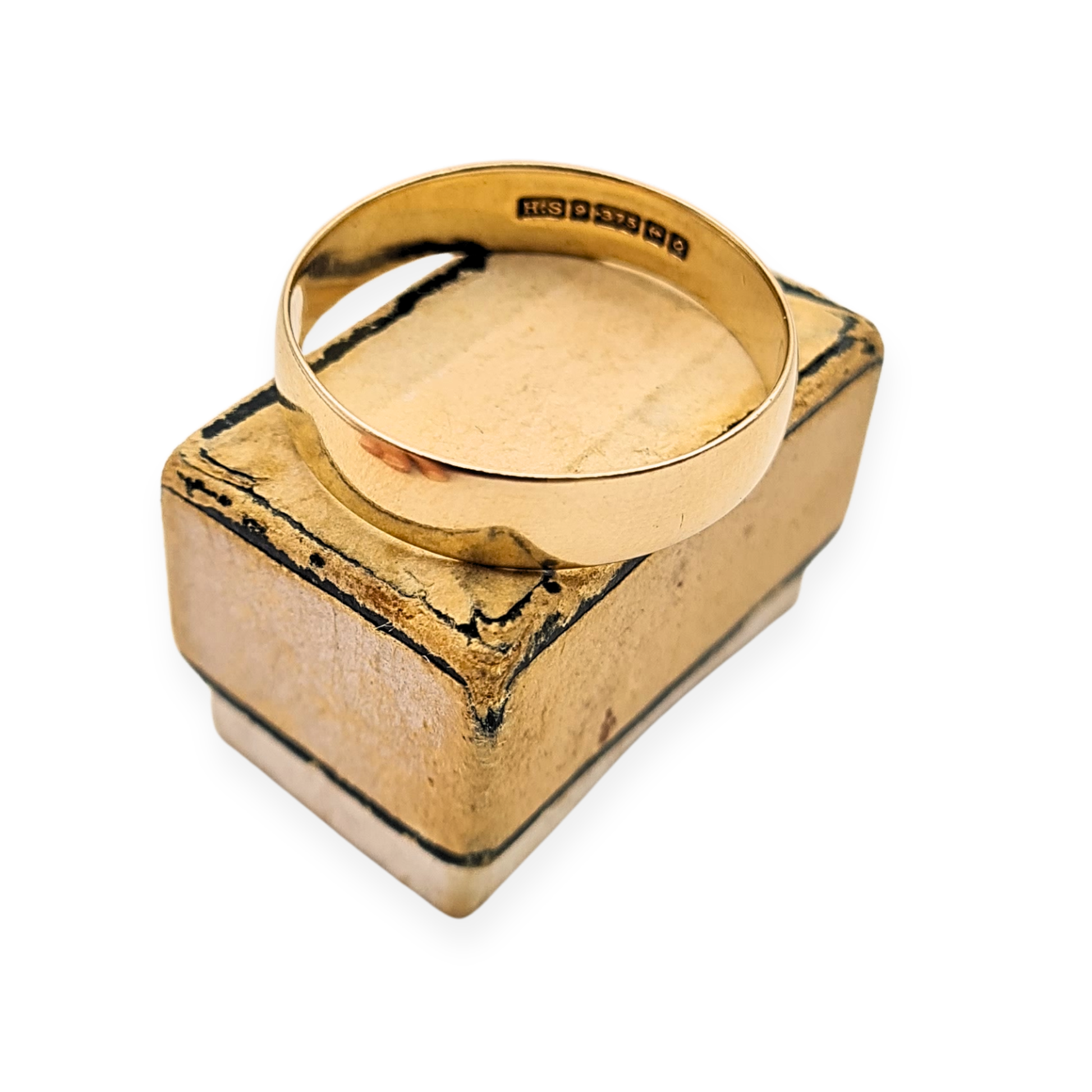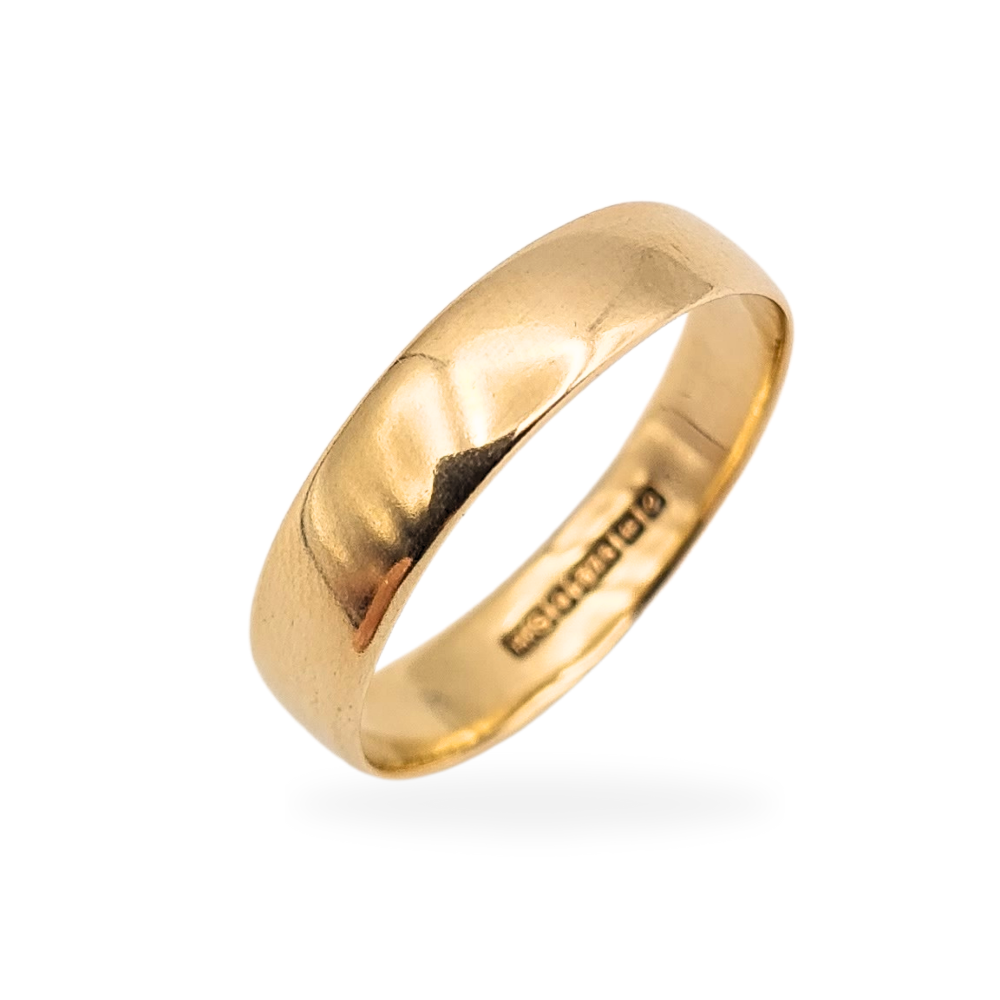 Hallmarked in Birmingham in 1988 and weighing 2.8g, this 9ct gold wedding band features a classic wide profile with a softly domed exterior. Measuring approximately 5mm across, it has a solid, comfortable feel on the hand and a traditional finish that suits everyday wear. A well-proportioned vintage band in a larger size, ideal as a wedding ring or a straightforward gold band worn alone- Only one available.