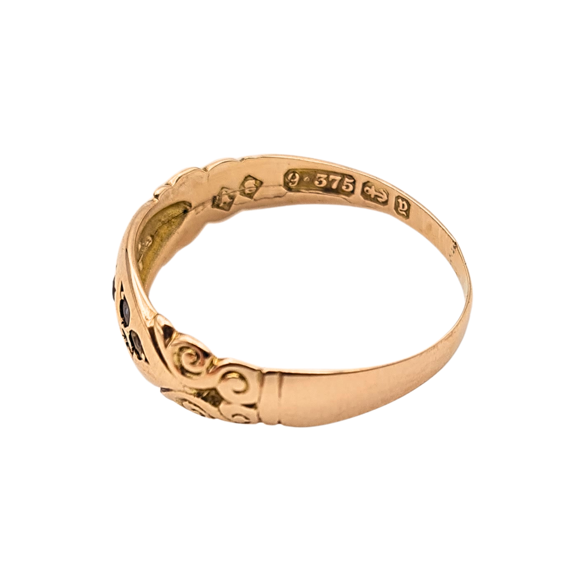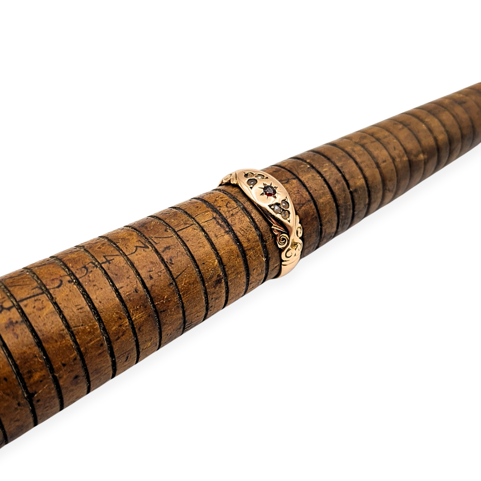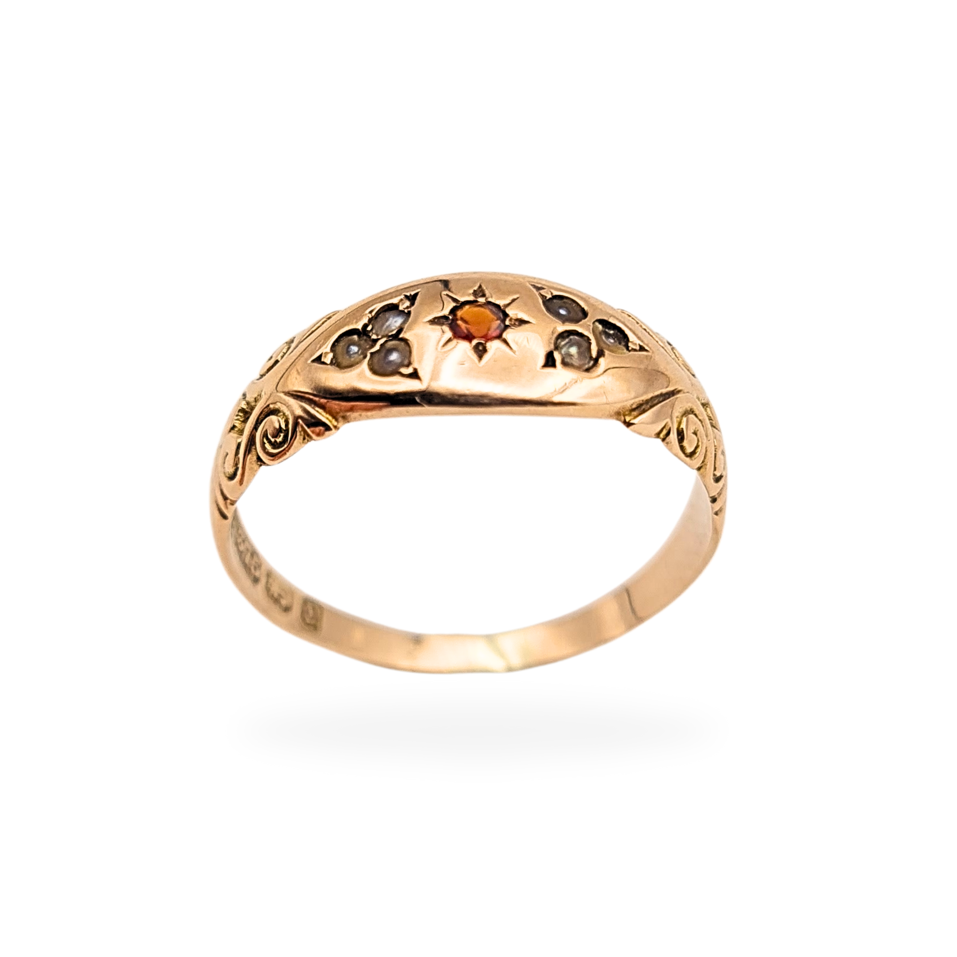 Hallmarked in Birmingham and likely dating to 1847, this antique 9ct rose gold ring features a central garnet framed by delicate seed pearls in a classic starburst setting. The shoulders are beautifully engraved with curling scroll motifs, lending an elegant Victorian character. Though the pearls show age-related wear and the ring has been resized, it remains an enchanting original piece with rich patina and charm. A wonderful collector’s ring or a thoughtful vintage gift.