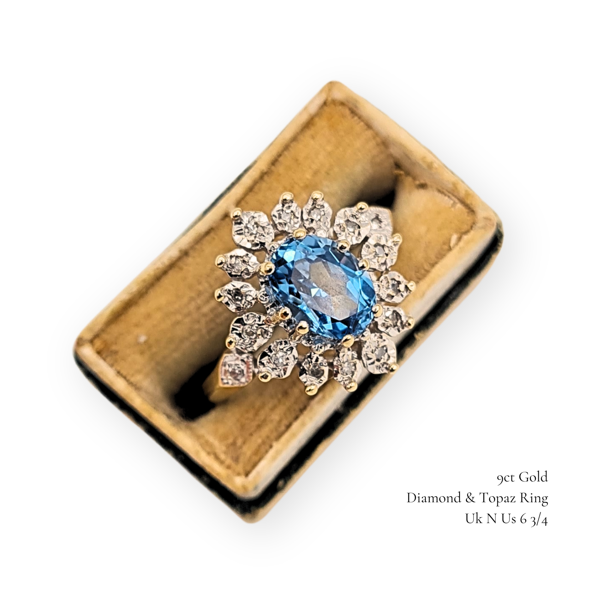 Gemstones: Blue Topaz (oval-cut centre), Diamonds (halo)