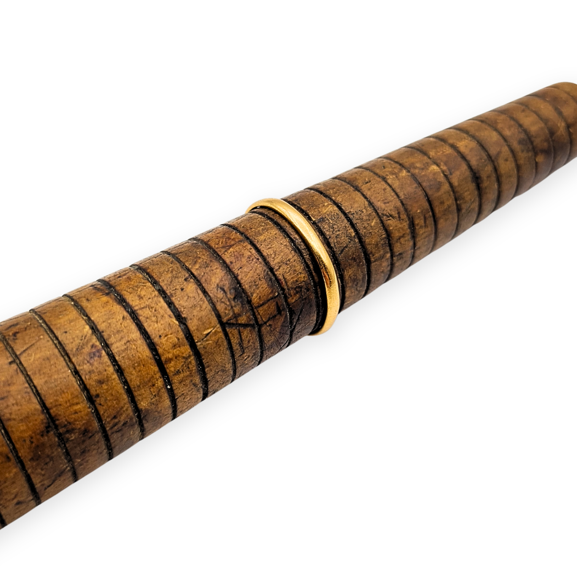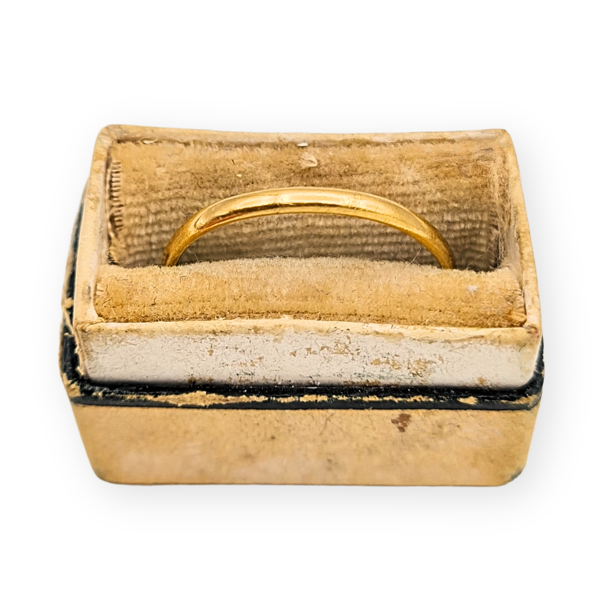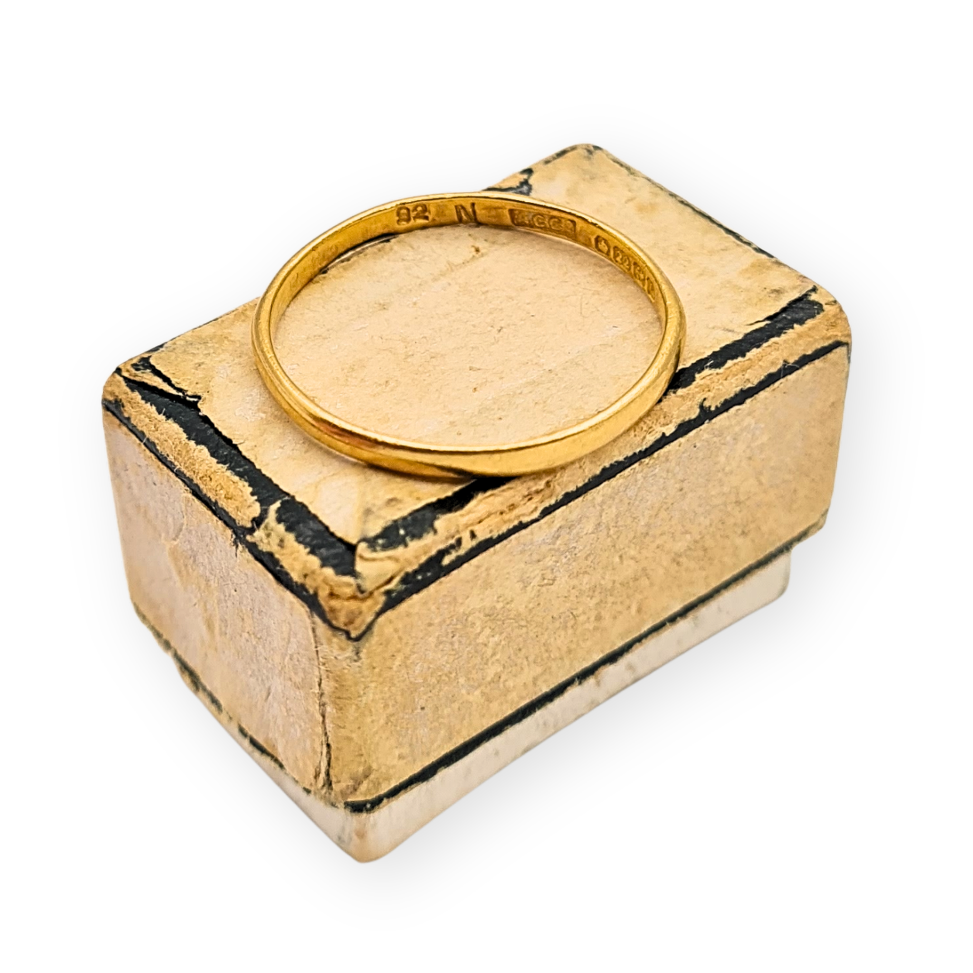 Hallmarked in Birmingham and dated 1940, this elegant 22ct gold ladies wedding band has a rich buttery tone and classic vintage charm. Measuring 2mm wide and weighing 1.2g, it’s dainty yet timeless — ideal as a wedding or stacking ring. Light surface marks reflect its age, and it’s been professionally cleaned and polished to restore its lovely lustre.