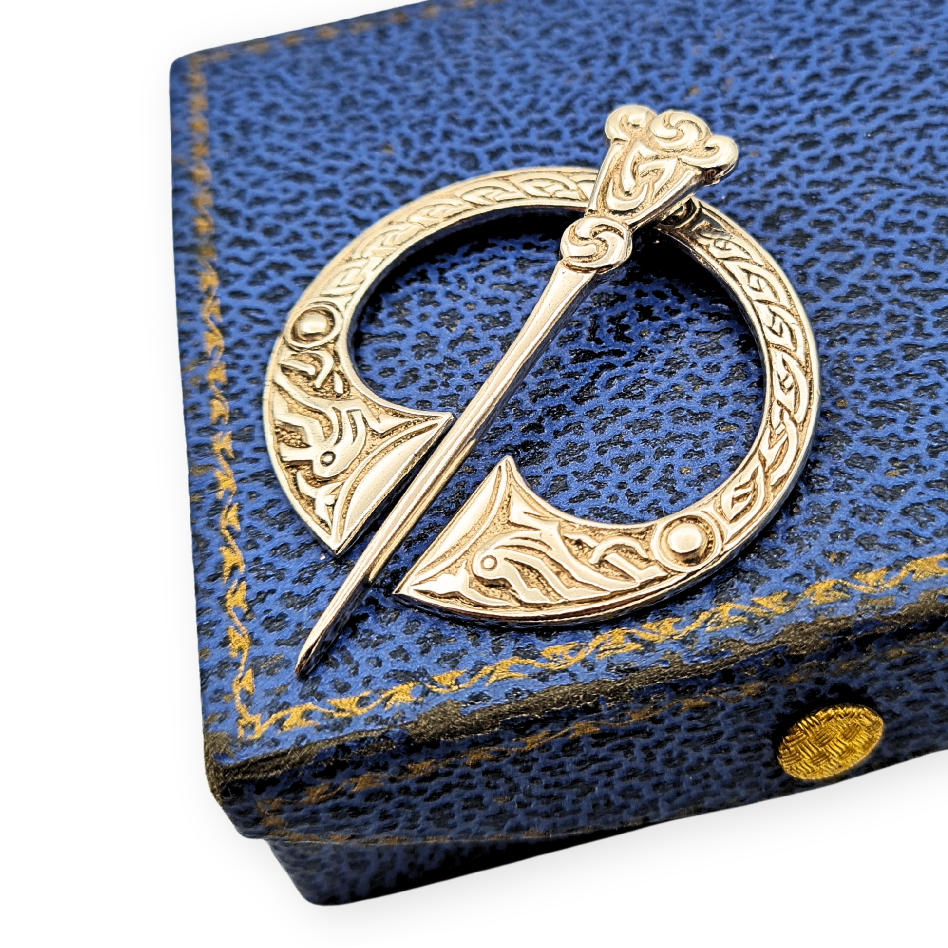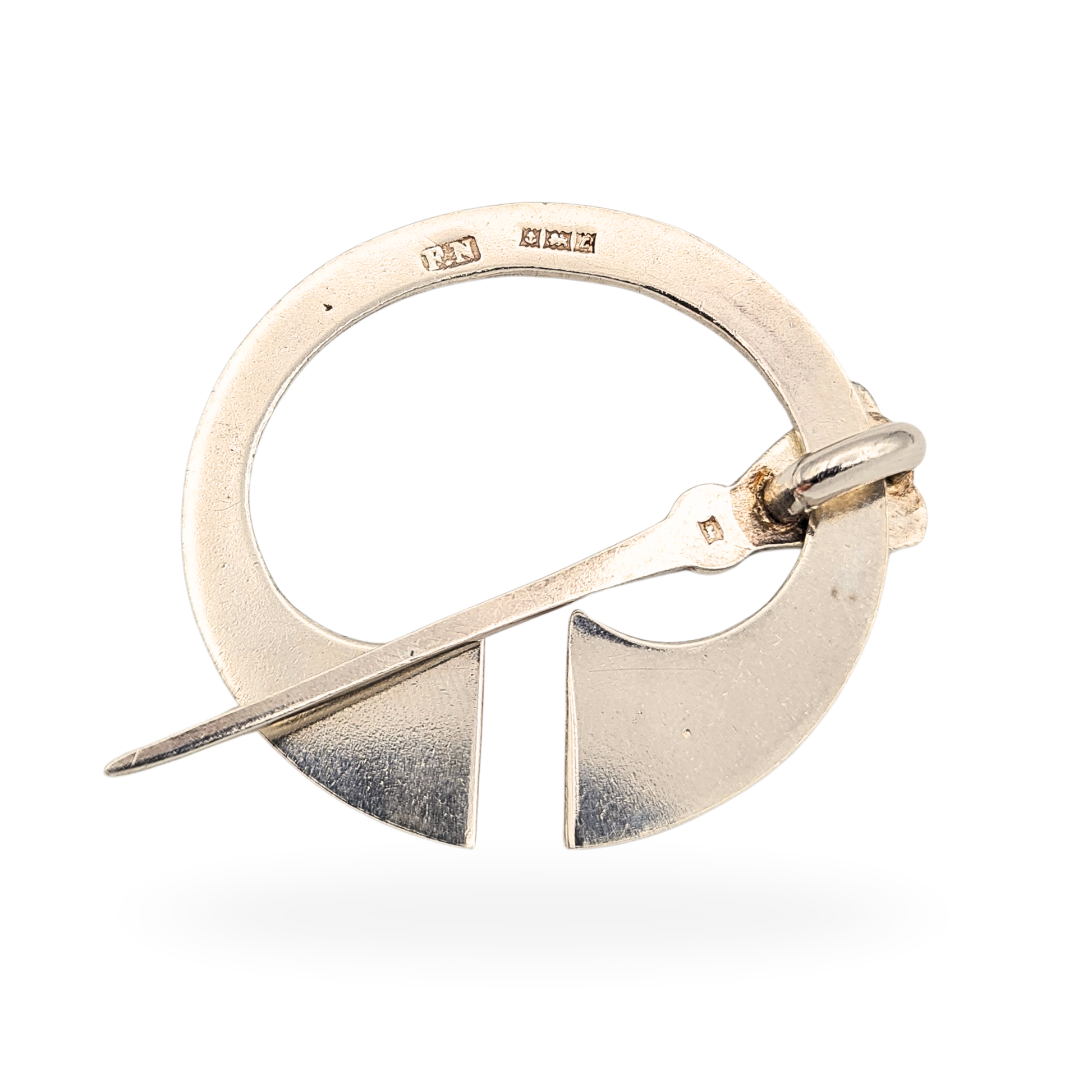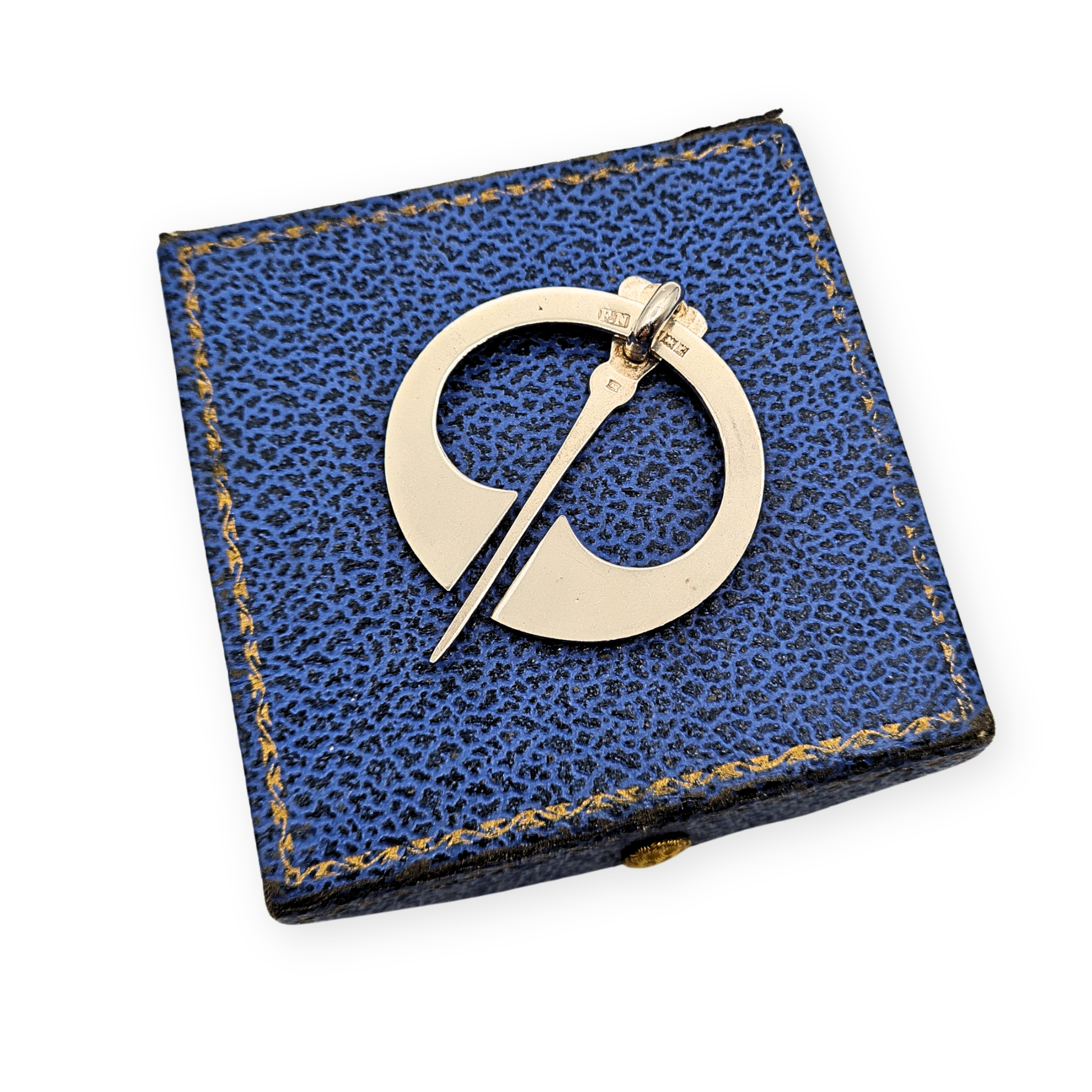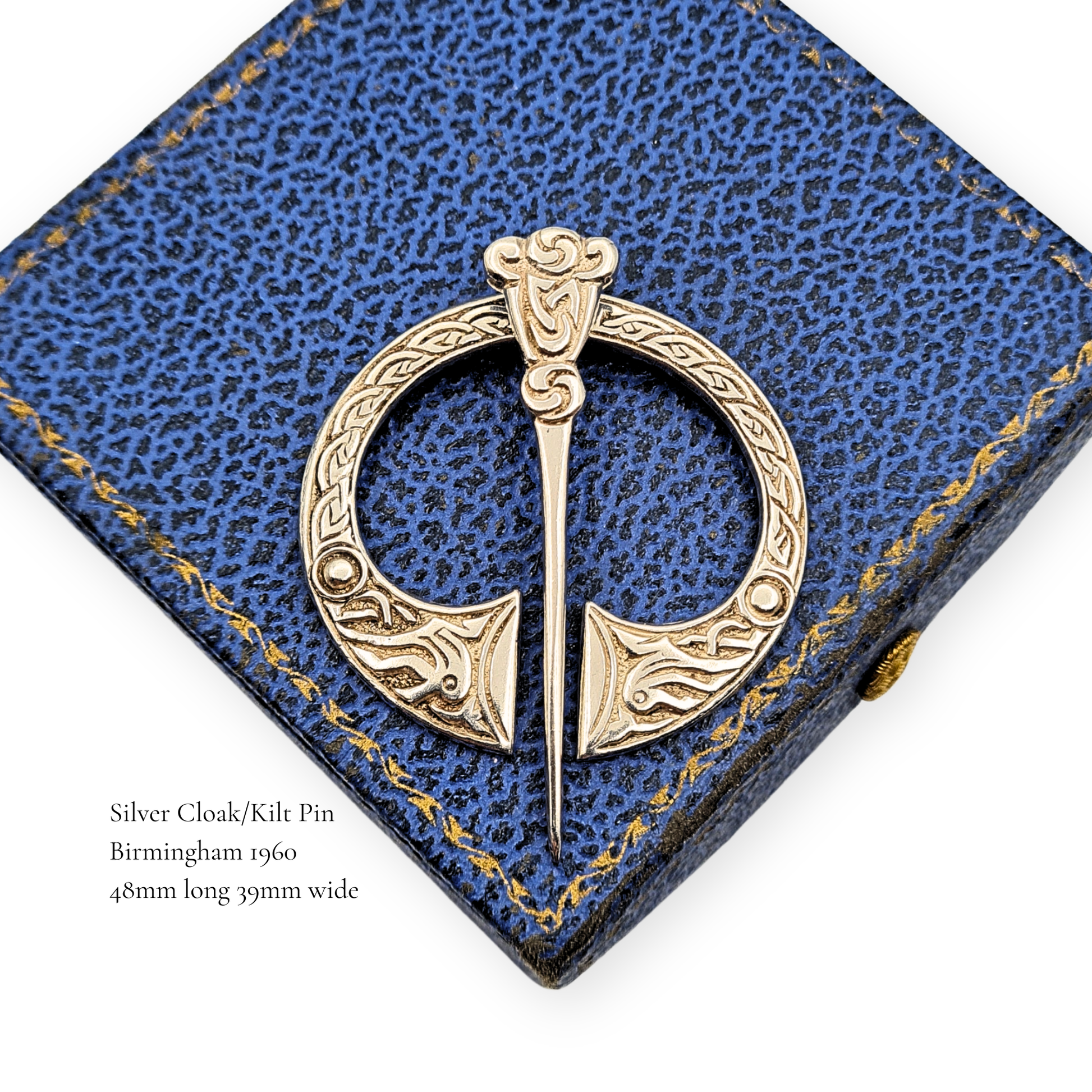 Fully hallmarked for Birmingham 1960, this striking sterling silver penannular kilt or cloak pin was crafted by F. Narborough of Lombard Street. The design, steeped in Celtic artistry, features intricate interlaced knotwork with raised bead accents, symbolising unity and eternity. Whether worn on Highland dress, a woollen wrap, or displayed as a collector’s piece, it carries both heritage and craftsmanship in equal measure. Only one available.