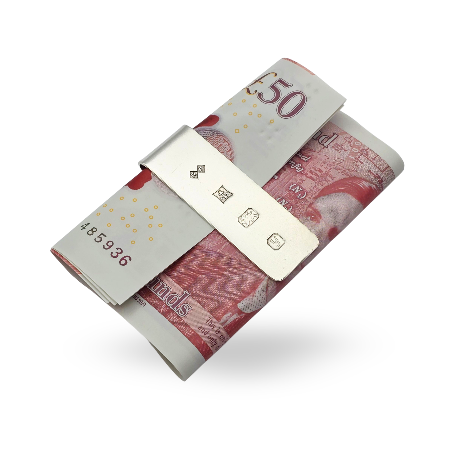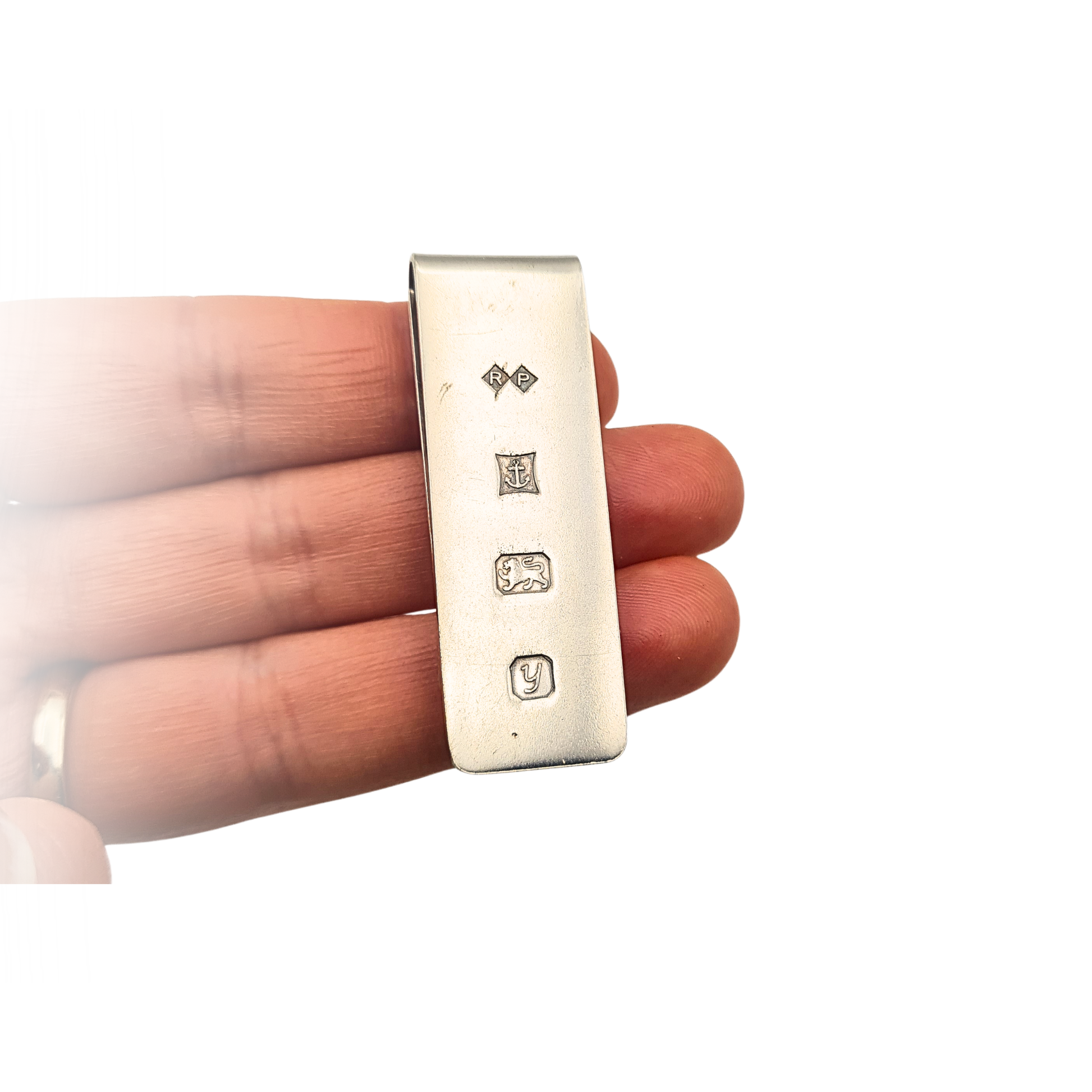 Fully hallmarked sterling silver money clip assayed in Birmingham in 1998, measuring approximately 48mm by 16mm and weighing 12.3g.