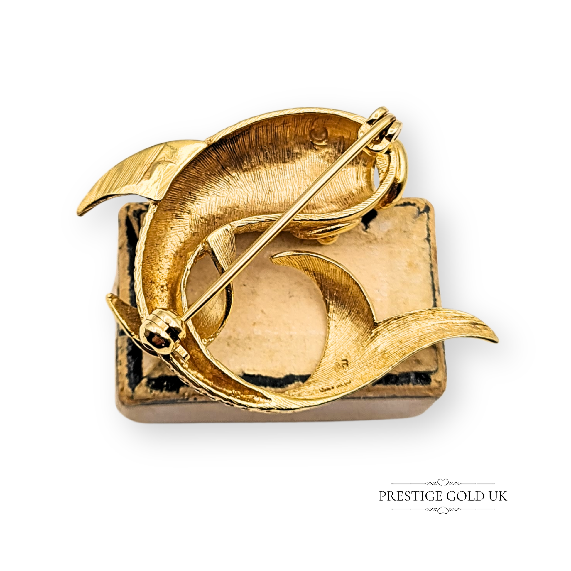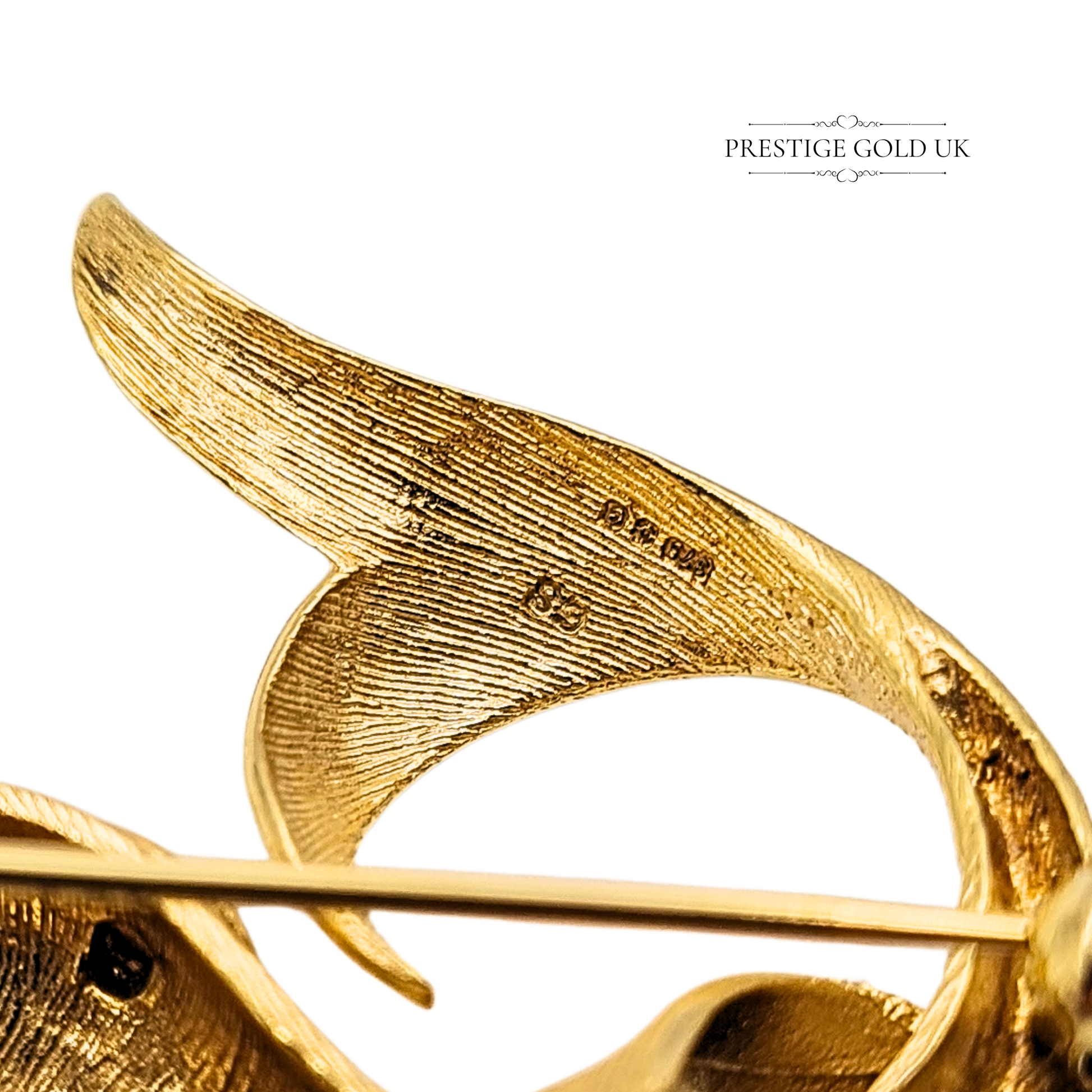 Hallmarked in London with an import mark for 1977, this striking 9ct solid gold brooch depicts a beautifully detailed koi carp in flowing motion — its sculpted fins and textured scales perfectly capturing the elegance of the fish in water. Weighing a substantial 6.7g, the piece feels luxuriously weighty for its size and features a secure pin and locking clasp for confident wear. A standout vintage statement brooch and a wonderful collector’s piece for lovers of finely crafted animal jewellery. Only one available.
