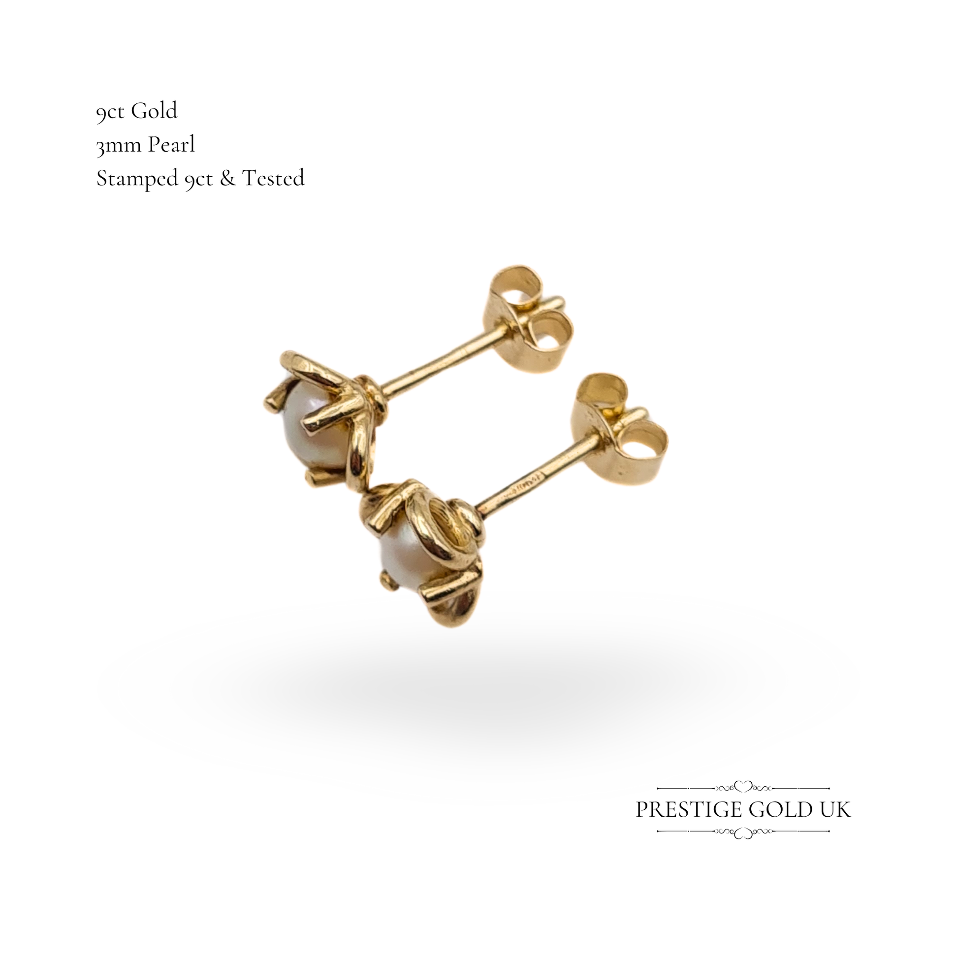 9ct Gold Pearl Stud Earrings, 3mm Cultured Pearls, Vintage Design, Butterfly Backs, Stamped 9ct, Dainty Earrings, Classic Gift for Her