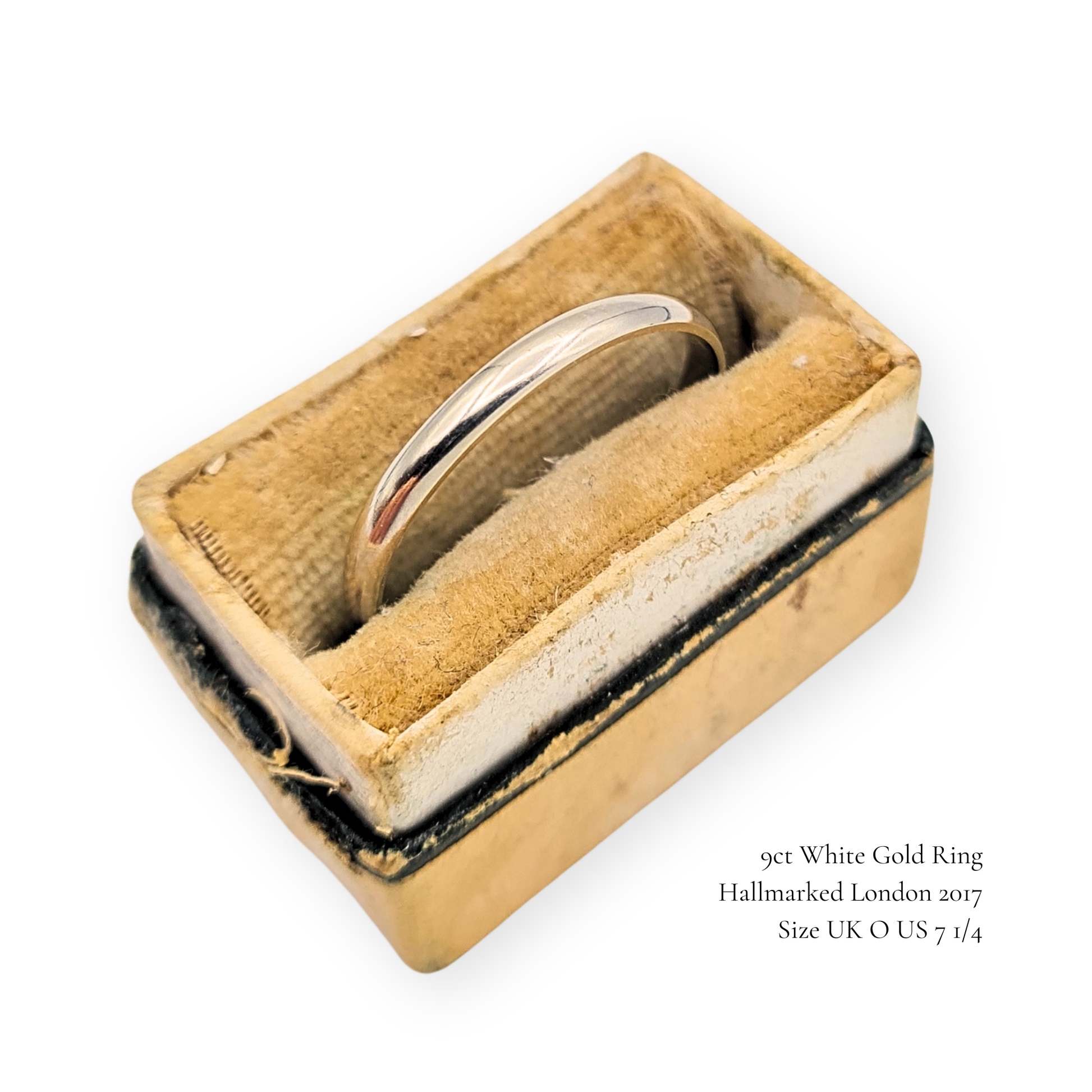 Hallmarked in London in 2017, this classic 9ct white gold wedding band is beautifully simple and refined. Measuring 2mm wide and weighing 1.1g, it’s an elegant and durable choice for everyday wear or as a contemporary wedding or stacking ring. The band is in lovely condition, showing light marks from gentle wear, now professionally cleaned and re-polished for a soft, bright finish.
